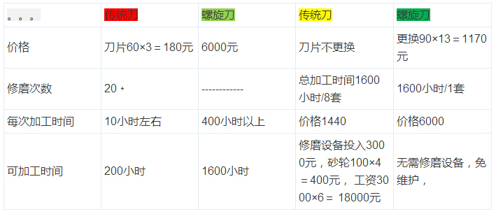 綜上結(jié)論傳統(tǒng)刀具每小時(shí)14.27元,螺旋刀具每小時(shí)3.75元,還沒(méi)算上節(jié)約的電量,螺旋刀切削阻力值是傳統(tǒng)刀具1/3可節(jié)約電量30%大大降低生產(chǎn)成本,六個(gè)月后螺旋刀片可拆下來(lái)修磨成本還可以大幅度下降。